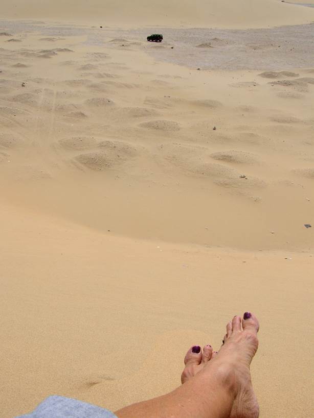 Climbing the dunes is strenuous. Wind whips the sand into a frenzy around me, pricks my skin, burns my eyes. Sand is in my hair, teeth, ears, nose, underwear. Grit chafes my middle. Flies buzz my head. I try to remember not to lick my lips (ick).